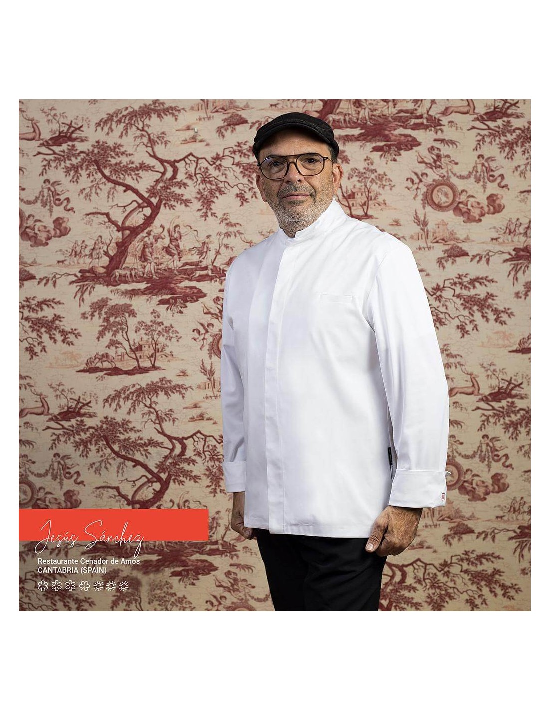 Chaqueta GASTROCHEF unisex en manga larga, con cuello mao, cierre cruzado mediante botones de presión ocultos y con bolsillo en manga izquierda. Modelo semi ajustado. Confeccionada con la revolucionaria fibra T400, una maravilla de la tecnología textil. Esta fibra elástica asegura un ajuste perfecto y una recuperación de forma en todas las direcciones, permitiéndote moverte sin restricciones mientras creas obras maestras culinarias. La fibra T400 brinda una comodidad excepcional, resistencia a las arrugas sobresaliente y un cuidado sencillo para que siempre luzcas impecable. La chaqueta tiene paneles de tejido piqué COOLMAX estratégicamente colocados en los costados y las mangas. Estos paneles técnicos trabajan incansablemente para regular la temperatura corporal y gestionar la humedad, asegurando que te sientas fresco y cómodo mientras das vida a tus creaciones culinarias. Es ideal para cocineros y chefs en hostelería, restauración y cocina en general.