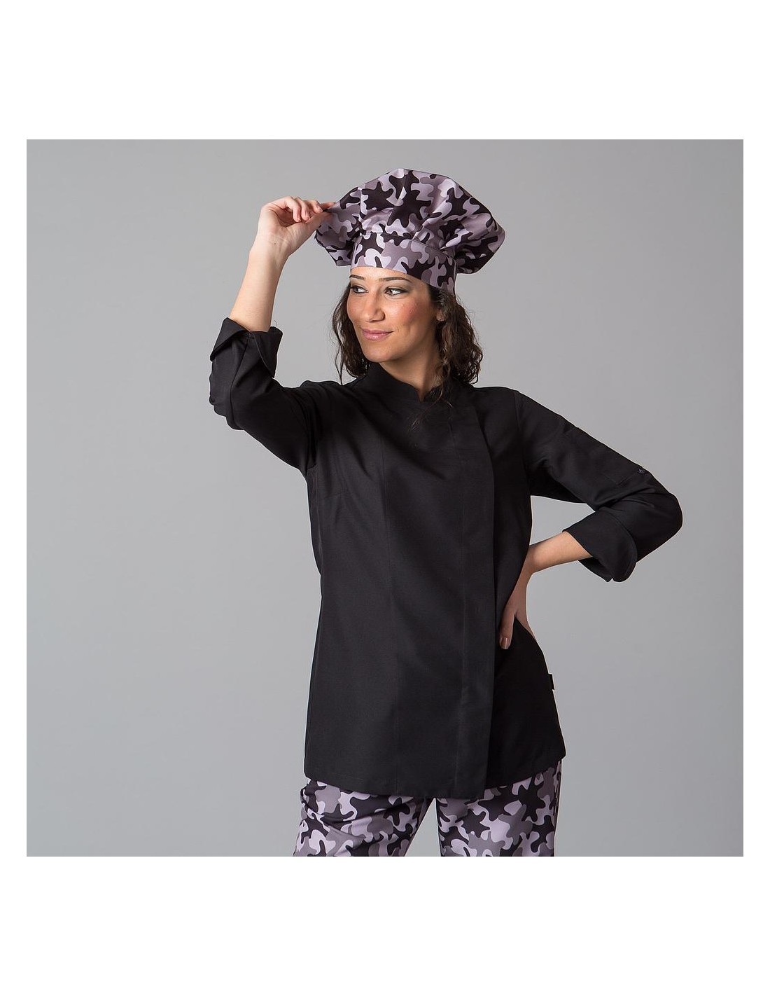 La chaqueta para cocinera de manga larga y cuello mao con aspecto moderno y fresco, resistente a salpicaduras de lejía y lavado a 90º, no requiere planchado se seca rápidamente.