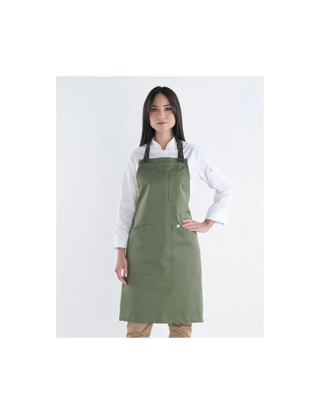 Delantal modelo Boulevard con peto y tira añadida de piel.