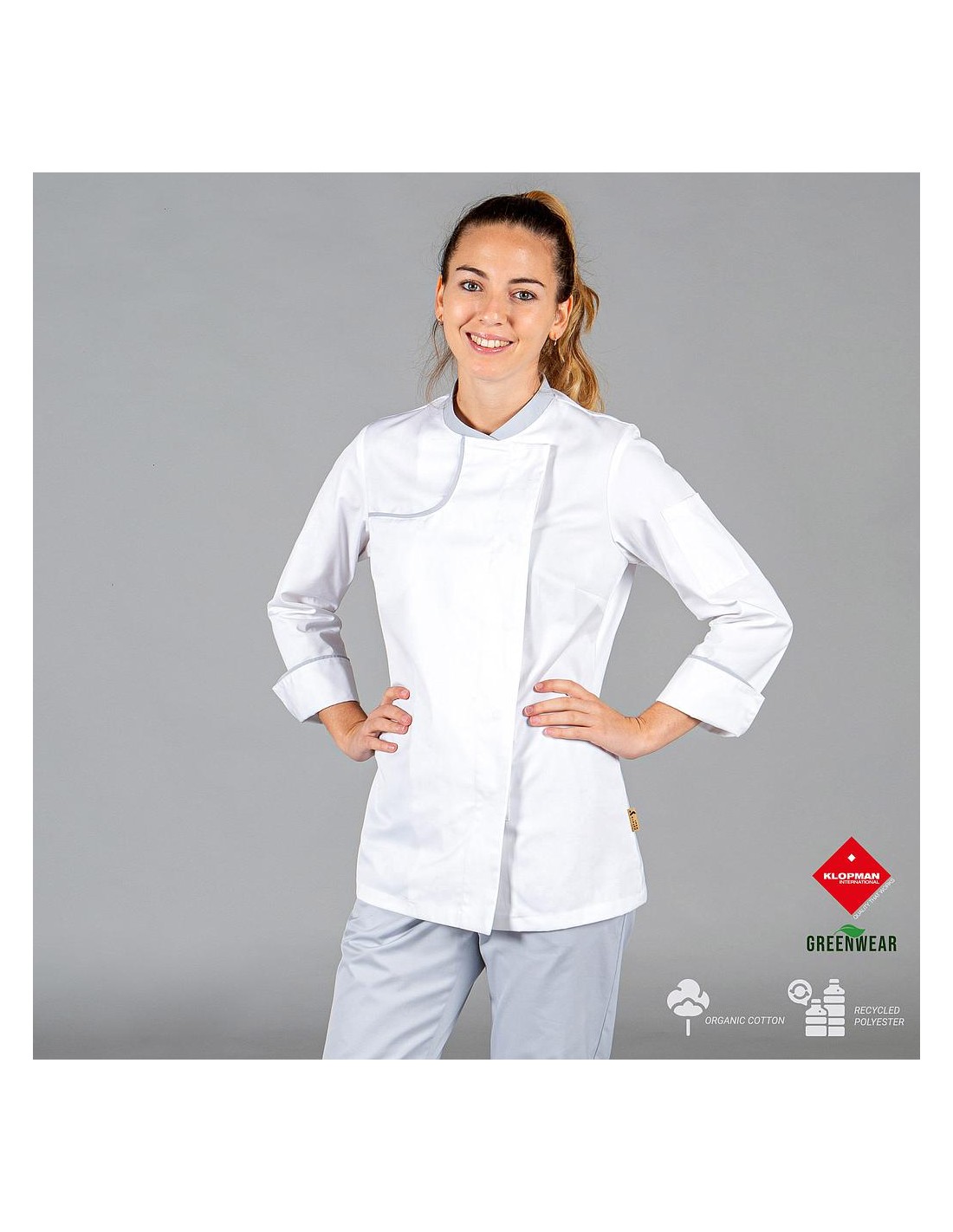 La chaqueta de cocina Anaya para mujer es una prenda de ropa de trabajo excepcionalmente diseñada para satisfacer las necesidades de las profesionales de la cocina. Confeccionada con tejido reciclado y orgánico de la reconocida marca Klopman, esta chaqueta no solo garantiza un alto rendimiento y durabilidad, sino que también se preocupa por el medio ambiente.