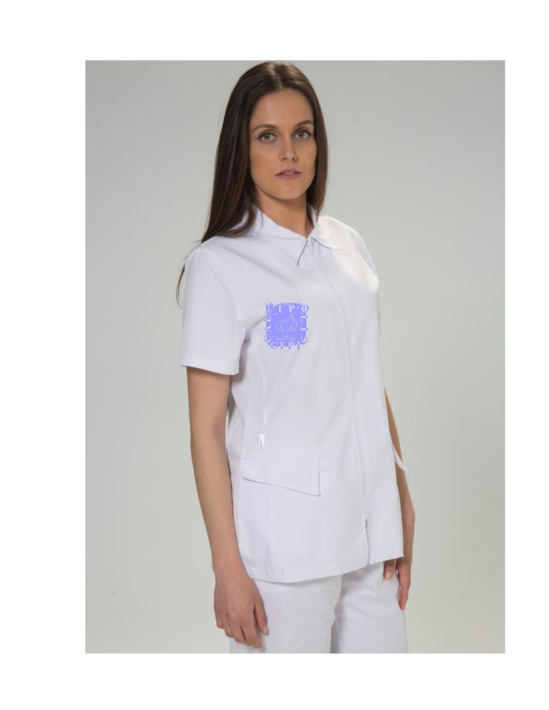 Casaca de estética tipo chaqueta con cierre de cremallera y manga corta para mujer. Esta es la casaca que utilizan las alumnas de "l'Institut Cal.lipolis" que realizan el curso de estética ya que va con el logo del instituto incorporado.