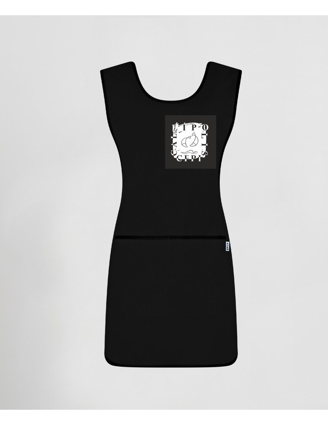 Estola de poliéster con bolsillo y de cierre con corchetes. Esta estola lleva el logo de "l'Institut Cal.lipolis" incorporado para todos aquellos alumnos que realizan algún curso de estilismo, caracterización y/o peluquería.