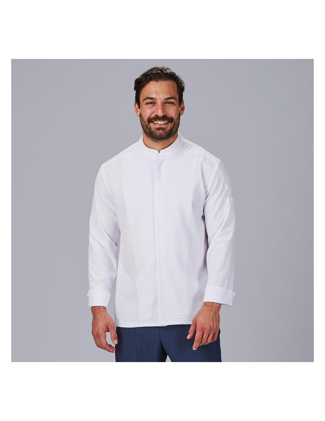 Sus paneles laterales de canalé elástico, el cierre de botones ocultos y el cuello mao aportan confort y un acabado profesional, convirtiéndola en una prenda práctica y elegante para chefs y personal de hostelería.