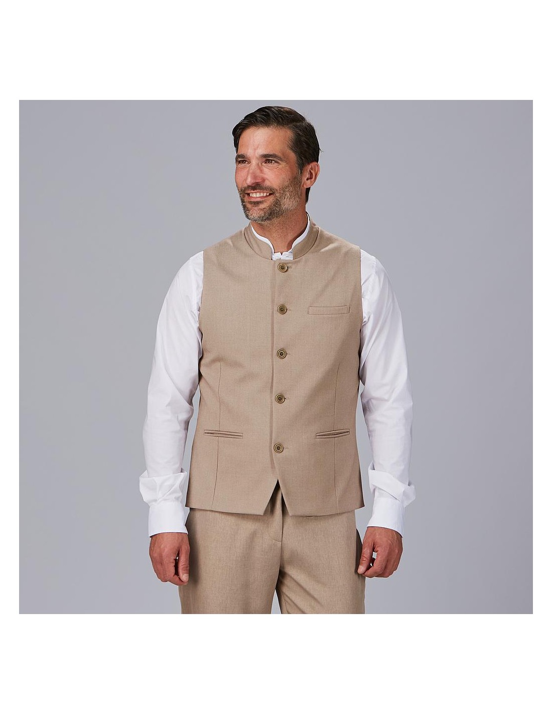 Ofrece un estilo moderno y funcional con corte semi ajustado y cuello mao, ideal para hostelería y atención al público. Confeccionado en sarga elástica, aporta comodidad, resistencia y un ajuste elegante. Incorpora botones vistos y bolsillos prácticos, y está disponible en marino y arena.